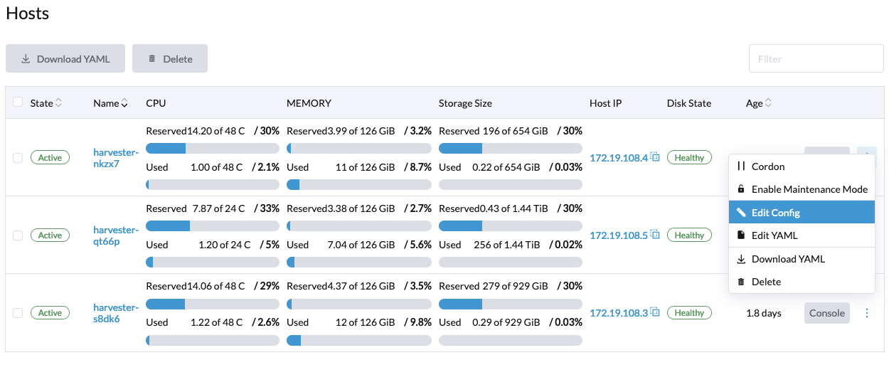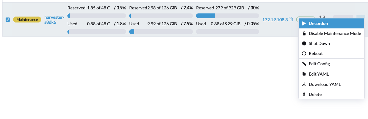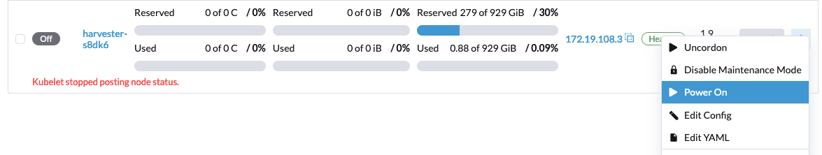 You can use the Harvester UI to shut down and reboot hosts once the Out-of-Band Access settings are configured. However, you must first enable Maintenance Mode, which automatically migrates all VMs to other nodes. harvester-seeder communicates with the hosts via IPMI when performing the selected operation.
