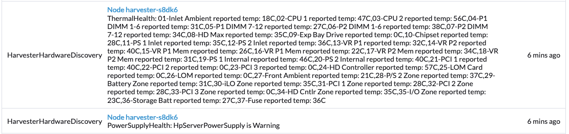 If you selected Enabled in the Event section of the Out-of-Band Access settings screen, harvester-seeder leverages Redfish to query the hardware for information about component failures and fan temperatures. The information is converted to Kubernetes events during hardware reconciliation and is subsequently handled by the Kubernetes garbage collection policy. Harvester stores these events for 1 hour by default.