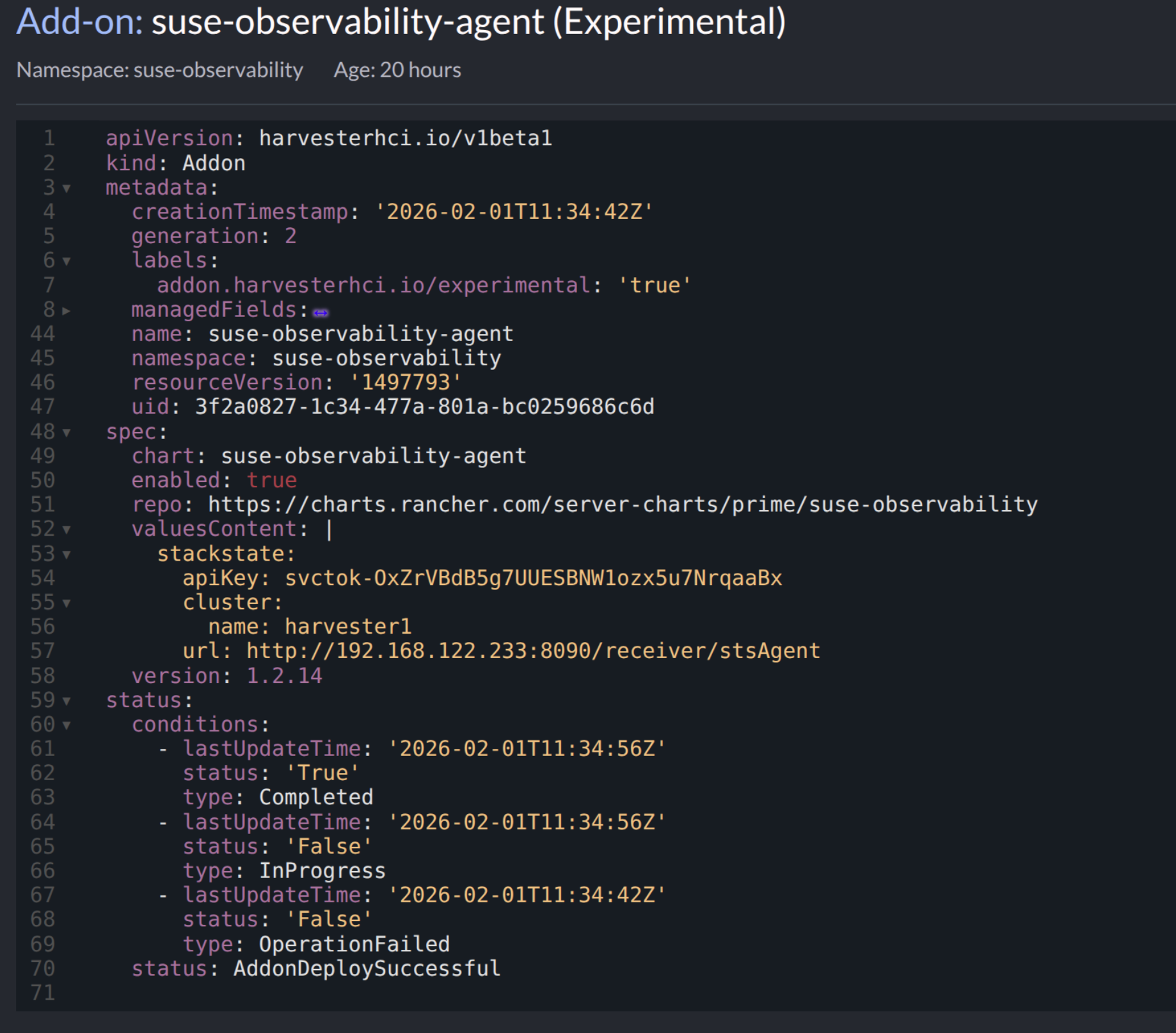 kubectl apply -f https://raw.githubusercontent.com/harvester/experimental-addons/main/suse-observability-agent/suse-observability-agent.yaml