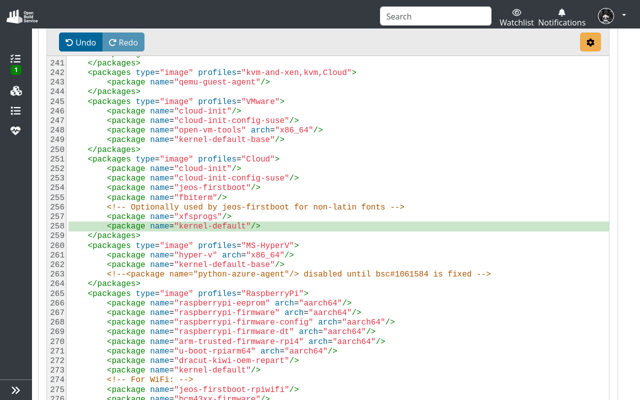 Select the file name to open the text editor. The <packages type="image"> section lists the packages to be installed. You can specify additional packages for each image profile.