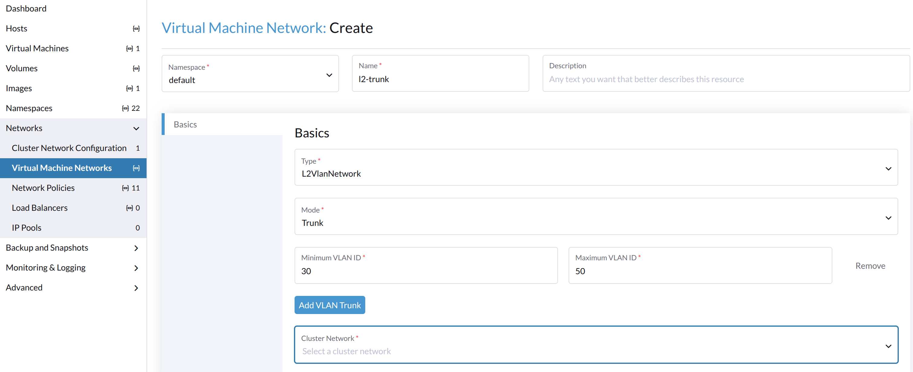 To create a new untagged network, go to the Networks > VM Networks page and click the Create button. You have to specify the name, select the type Untagged Network and choose the cluster network.