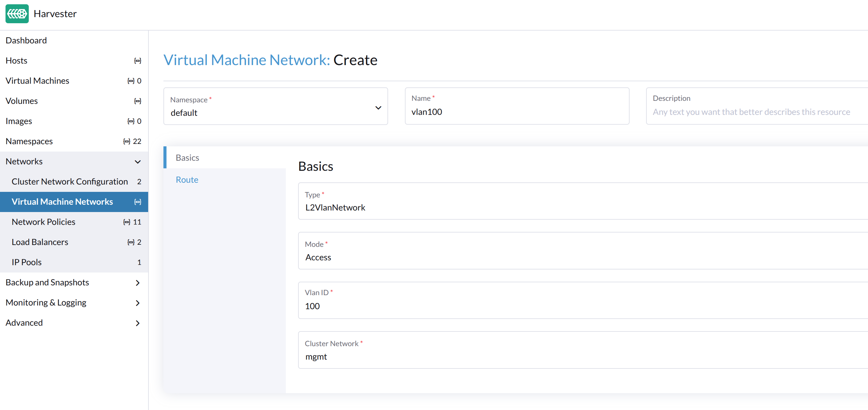 When you change the network type from VLAN to VLAN Trunk or Untagged, the settings you configured on the Route tab are removed. You must reconfigure these settings if you decide to change the network type back to VLAN.