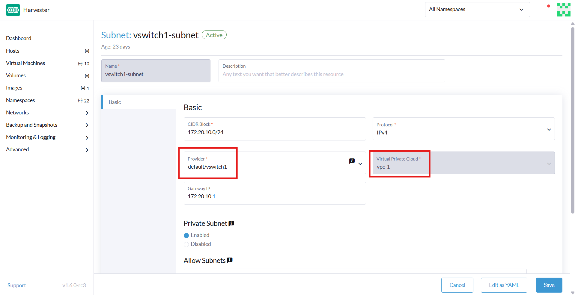 Each subnet defines a CIDR block and gateway, and is mapped to a Harvester overlay network (virtual switch). It also includes controls for NAT and access rules.