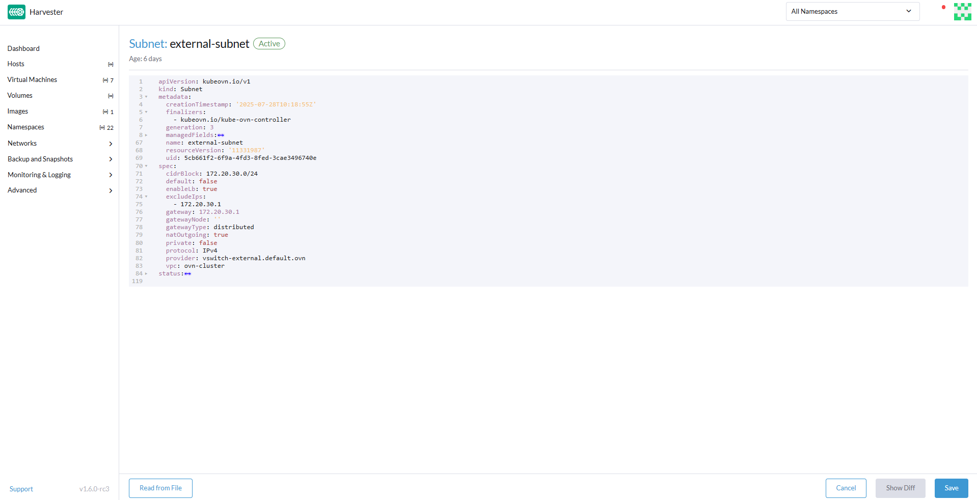 Harvester focuses purely on compute and network attachment. Network policy enforcement, private subnets, and NAT egress are managed by Kube-OVN.
