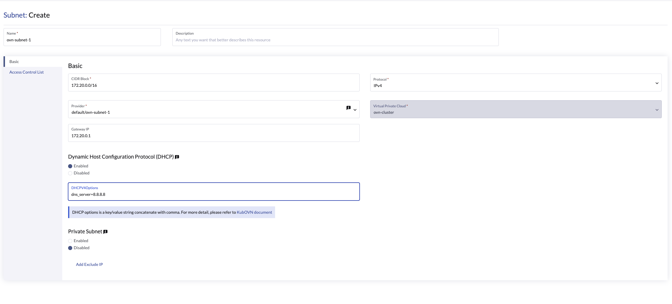 Basic tabAllow SubnetsCIDRs that are allowed to access the subnet when Private Subnet is enabled
