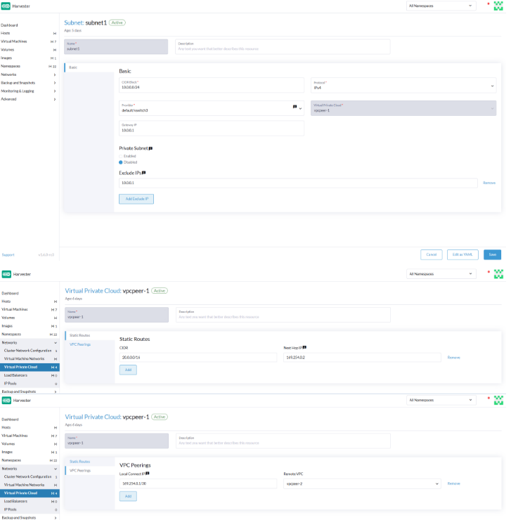 Harvester provides a default VPC named ovn-cluster, and two associated subnets named ovn-default and join for internal Kube-OVN operations. You can create additional VPCs by clicking Create on the Virtual Private Cloud screen.