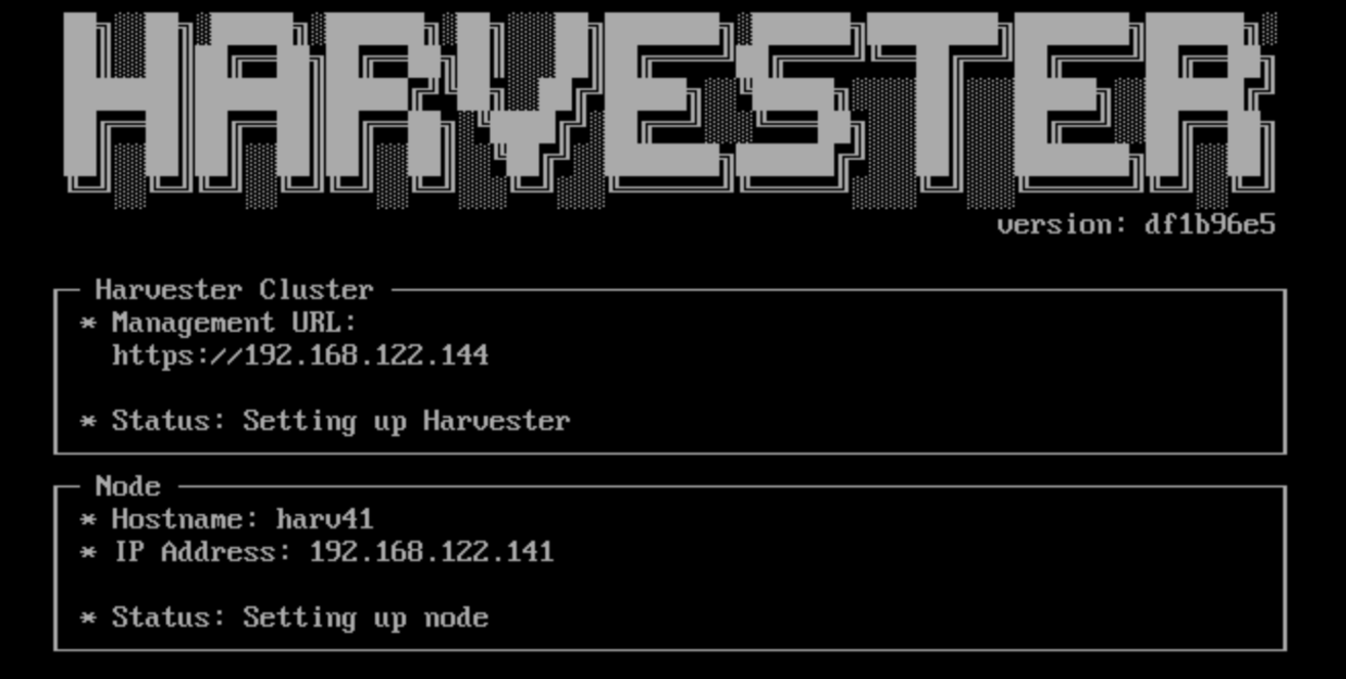 Harvester Console shows "Setting up Harvester" after day 0 Installation