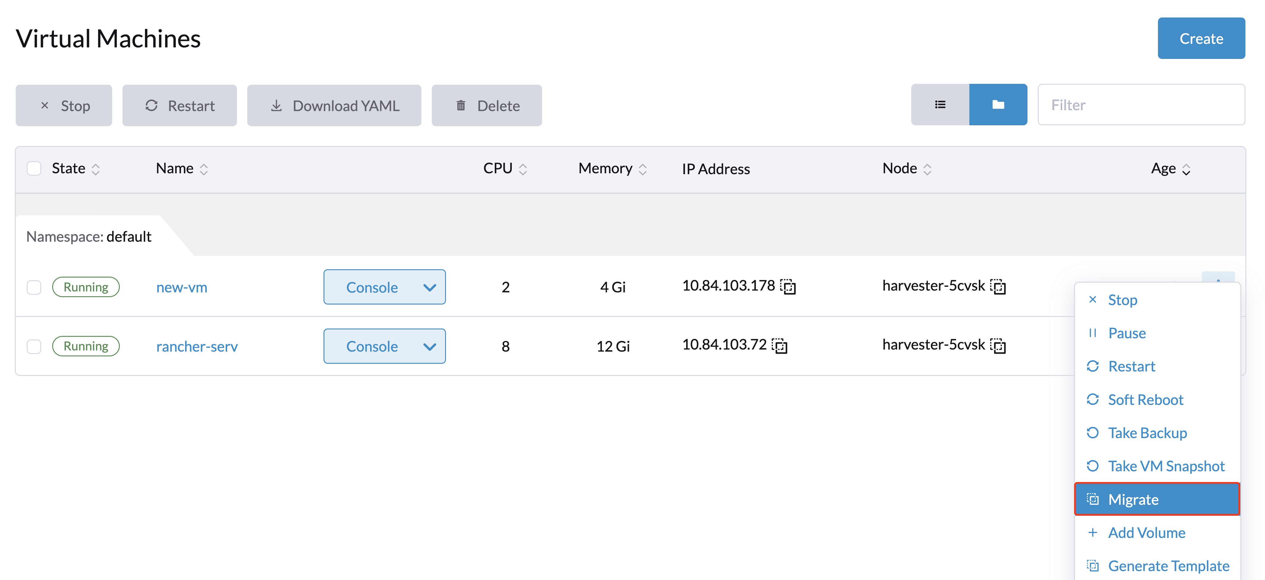 2. Find the virtual machine that you want to migrate and select ⋮ > Migrate.